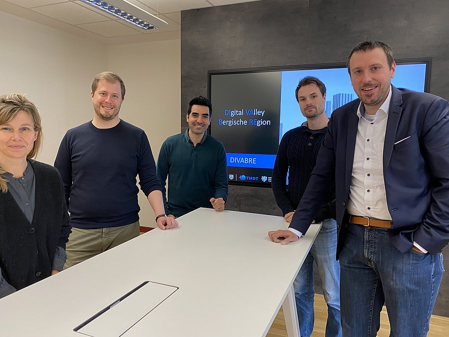 Das Forschungsprojekt soll den bergischen Mittelstand auf dem Weg in eine digitale Zukunft unterstützen. Sein Titel fasst die Zielsetzung des Vorhabens zusammen: Digital Valley Bergische Region (DIVABRE), angelehnt an das Silicon Valley. Dem Projektteam (Foto v.l.n.r.) Nicole Nelißen, Tristan Langer, Hasan Tercan, Richard Meyes und Dr.-Ing. André Pomp geht es vor allem darum, die Unternehmen in der Bergischen Region mit Studierenden zu vernetzen. Das soll anhand konkreter Aufgabenstellungen auf einer Daten-Plattform geschehen und könnte für beide Seiten eine win-win-situation sein. „Die Unternehmen erhalten eine Lösung für ihr konkretes Problem und lernen so potentielle Arbeitnehmer kennen. Die Studierenden kommen in Kontakt mit potentiellen Arbeitgebern.“