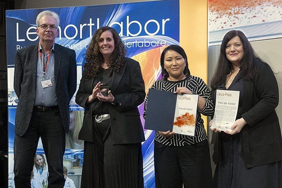 Die Freude ist riesig, denn unser Team hat den 1. Platz belegt! Der Preis wurde vom LernortLabor - Bundesverband der Schülerlabore e.V. gefördert vom Bundesministerium für Bildung, Familie, Senioren, Frauen und Jugend verliehen für ihre Idee der MINT-Arena - MINT meets Sport! Die tolle Idee MINT und Sport zu verbinden plus das überzeugende Bewerbungsvideo hat die Jury begeistert. Bei der Abendveranstaltung der diesjährigen 21. LeLa Jahrestagung in Osnabrück wurde unser Team gestern ausgezeichnet.
