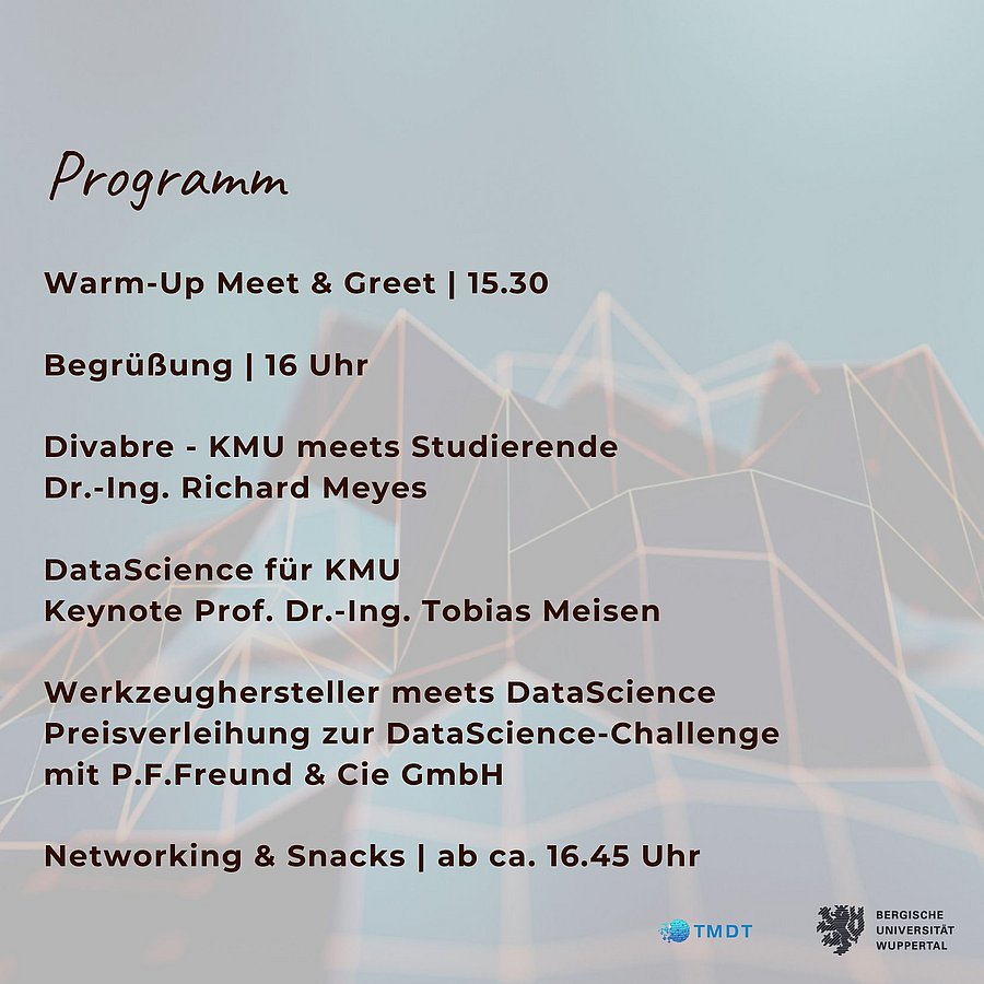Kommt vorbei, erfahrt mehr über unsere Challenges, lernt die Forschung unseres Lehrstuhls im Bereich Data Science und KI kennen und tauscht Euch in lockerer Atmosphäre und bei Snacks mit Unternehmensvertretern aus der Region aus!