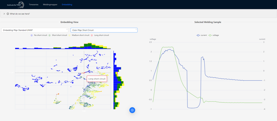 Die neue Version der Demo-Website bietet eine Präsentation eines wissenschaftlichen Lichtbogenschweißmodells und eine interaktive Ansicht einer gelernten Repräsentation (Embedding) eines Deep Learning Modells. Die ursprünglichen Repräsentationen bestehen aus hochdimensionale Vektoren. Diese sind jedoch schwer zu analysieren. Daher haben wir die Repräsentationen mit Methoden, die die wichtigsten Informationen der Repräsentation bewahren, in einen zweidimensionalen Graphen abgebildet. Dies ermöglicht es, die Darstellung in Hinblick auf die zugrunde liegenden Zeitreihen eines Schweißprozesses zu untersuchen.