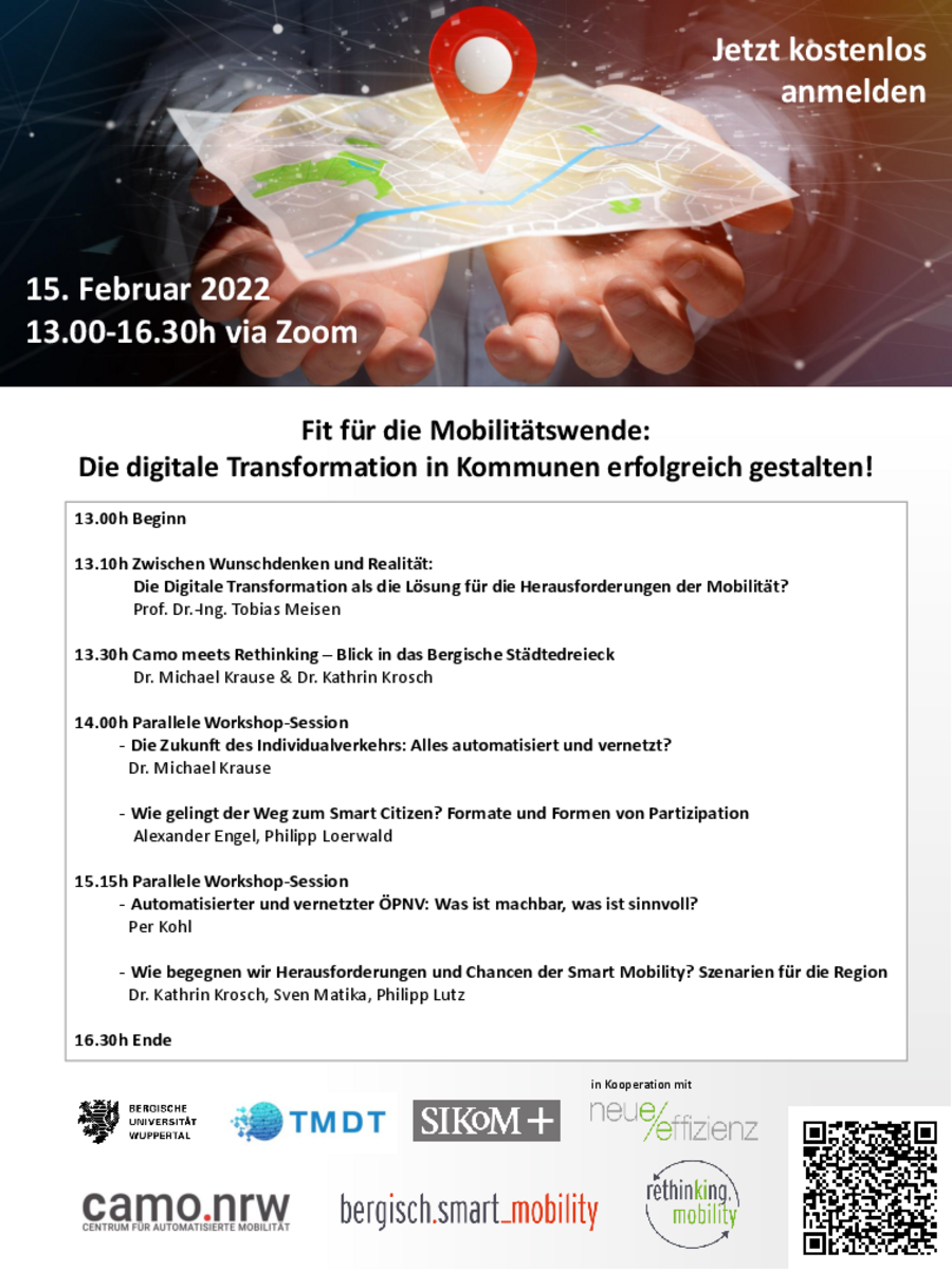 Wir möchten mit Ihnen die Ergebnisse unserer Projekte diskutieren und unsere Erfahrungen mit Ihnen teilen. Wir freuen uns insbesondere auf eine lebhafte Teilnahme kommunaler Vertreter*innen als auch Expert*innen aus Wissenschaft und Wirtschaft.