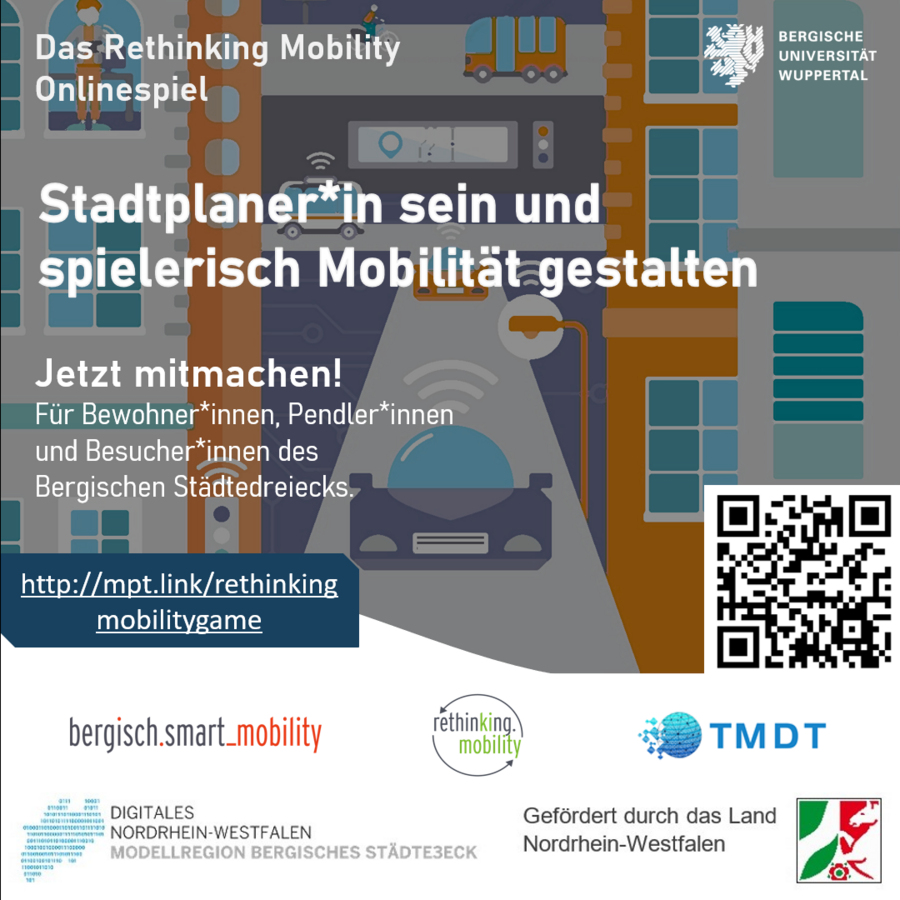 Der Zweck des Spiels ist es, Spaß zu haben und sich mit dem derzeit viel diskutierten Thema Mobilität zu beschäftigen. Wenn es einen Gewinner gibt, dann ist es das Bergische Städtedreieck, indem Sie Ihre Vision und Ihr Mobilitätskonzept für eine bessere Mobilität im Morgen entwerfen.
