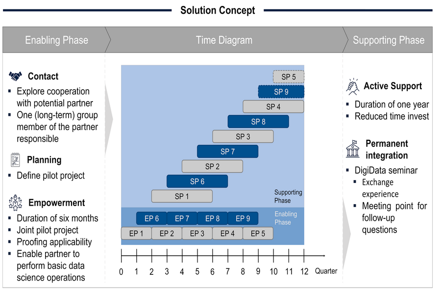 Im Mittelpunkt steht der Wissens- und Methodentransfer in einem forschungsprojektähnlichen Enabling-Prozess, in dem ein Data Scientist die Transferpartner bei der Nutzung von Digitalisierung und Data Science in ihrem Bereich unterstützt und sie im effektiven Umgang mit diesen Werkzeugen schult. Während sich klassische Forschungskooperationen auf den ersten Teil konzentrieren, liegt der Schwerpunkt des Projekts auf dem zweiten Teil. Mit diesem Prozess möchte das TMDT die Partner auch in ein neues KI-Ökosystem an der Bergischen Universität Wuppertal einbinden, in dem die weitere Qualifizierung der Partner strukturiert vorangetrieben wird. Auf diese Weise trägt DigiData zur erfolgreichen Digitalisierung an der Bergischen Universität Wuppertal bei und dient als Vorbild für eine neue Form des interdisziplinären Wissens- und Methodentransfers.