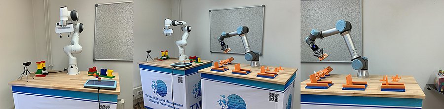 In unserem Roboterlabor erforschen wir den Einsatz von KI-Methoden in der industriellen Robotik. Das Labor bietet mit zwei Arbeitsplätzen Raum für kreatives und produktives Arbeiten, sowohl im Rahmen unserer Projekte als auch in der Form von praxisnahen Abschlussarbeiten. Mit unseren zwei Cobots, ein Universal Robots UR5e und ein Franka Emika Panda, können wir schnell realweltliche Anwendungsszenarien darstellen. Hierbei untersuchen wir Methoden zur KI-gestützten Automatisierung - von der Verbesserung der Wahrnehmung eines Roboters in Form einer Deep-Learning-basierten Bauteilerkennung bis hin zu autonomen intelligenten Agenten, die Montageaufgaben erlernen. Auch wenn unsere Roboter im Labor zu Hause sind, reisen sie gerne: Durch einen modularen Aufbau können wir unsere Demonstratoren einfach zu Projektabschlüssen, Messen oder Vorträgen mitnehmen und unsere Forschungsergebnisse greifbar darstellen.
